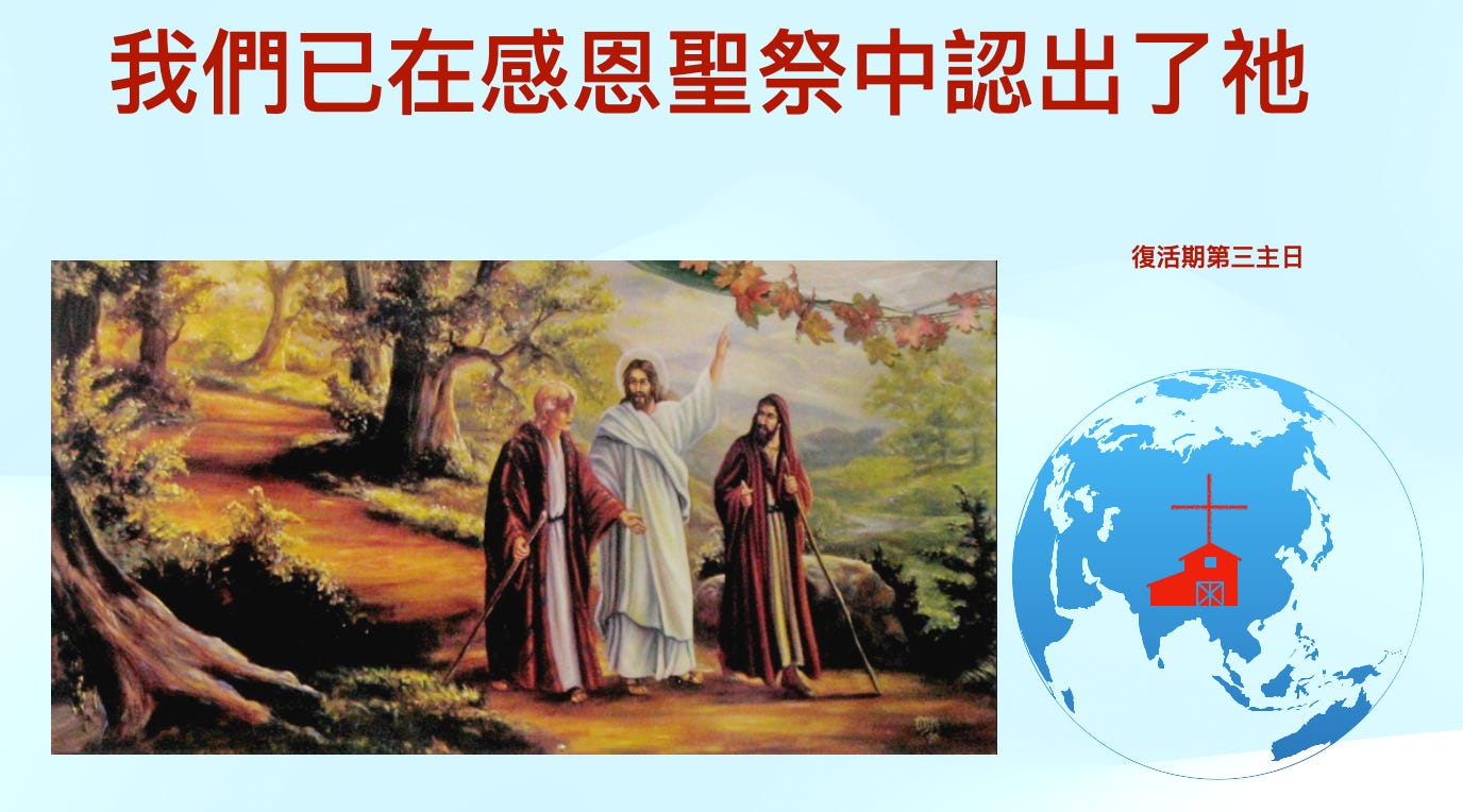 感恩聖祭包括兩個主要部分:聖道禮儀和聖祭禮儀。今日福音的結構也是如此。當基督加入這兩位門徒中,並詢問他們交談的話題時,聖道禮儀開始了。兩位門徒分享了有關耶穌的一條消息,這消息只是有關祂的宣講、神蹟奇事,以及祂在十字架上的悲慘死亡(路24:19-20),卻缺乏兩個重要因素:基督死亡的意義和基督復活的宣報。沒有這兩個要素,就不是好消息——福音。